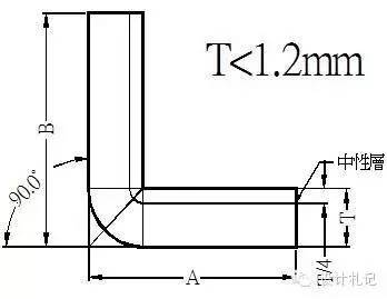4.2 R=0, θ=90° (T≧1.2,含1.2mm) L=(A-T)+(B-T)+K =A+B-2T+0.5T 上式中取:λ=T/3 K=λ*π/2 =T/3*π/2 =0.5T |